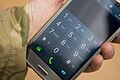 Close up of mobile phone, with a hand showing a camouflage cuff. MOD 45155935.jpg 3,600 × 2,400; 5.79 MB