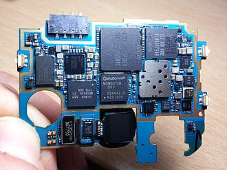 English: Mainboard of Samsung Galaxy S4 (I9505) smartphone. The Qualcomm snapdragon APQ8064 SoC lays underneath the Samsung flash chip. |