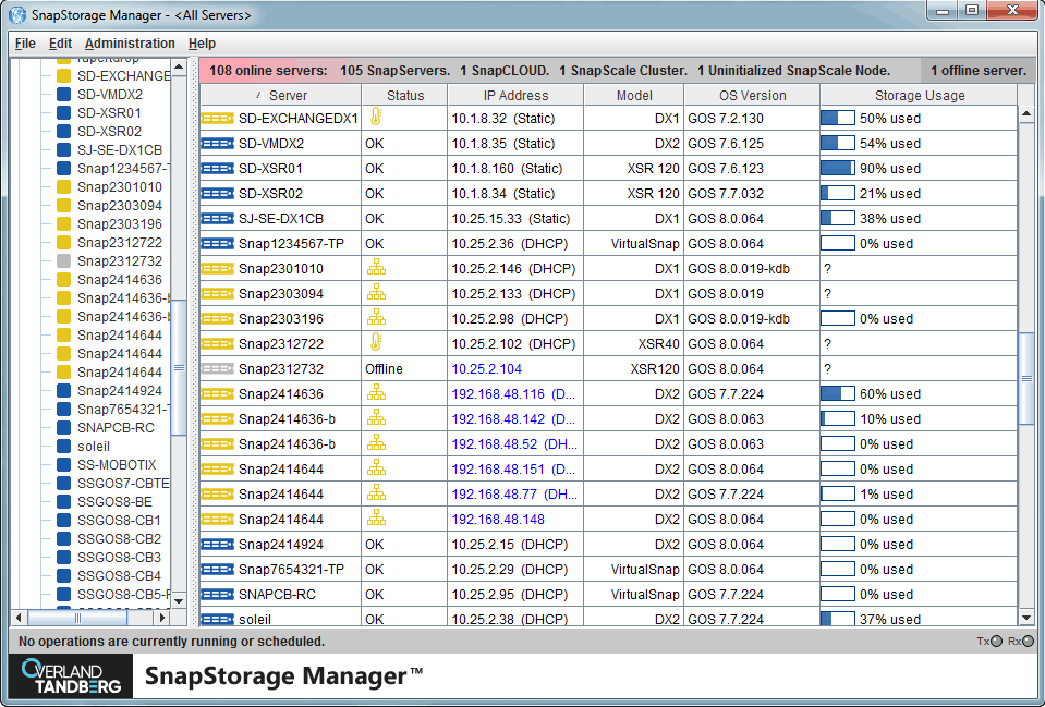 The SSM is a Java-based application supported on nearly all versions of Windows, Linux, and MacOS. It enables remote administration on all discoverable SnapServer appliances. It enables administrators to remotely manage any SnapServer product, providing a monitoring overview, bulk upgrading capabilities, and system tasks such as restarts and shutdowns.
