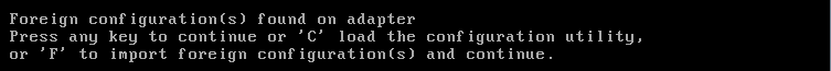 RAID controller error message: “Foreign configuration(s) found on adapter. Press any key to continue, or ’C’ to load the configuration utility or ’F’ to import foreign configuration(s) and continue.”
