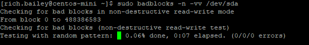 Step 2 – Run disk utility tool BadBlocks to scan the selected disk and type “sudo badblocks -n -vv /dev/sda1”. This will perform a hard drive disk scan looking for bad blocks. Note that it is possible for this scan to overwrite data, so do not perform this test if you are worried about losing critical files. The scan will take a very long time to complete, but the success rate is usually very high with an I/O Device Error.