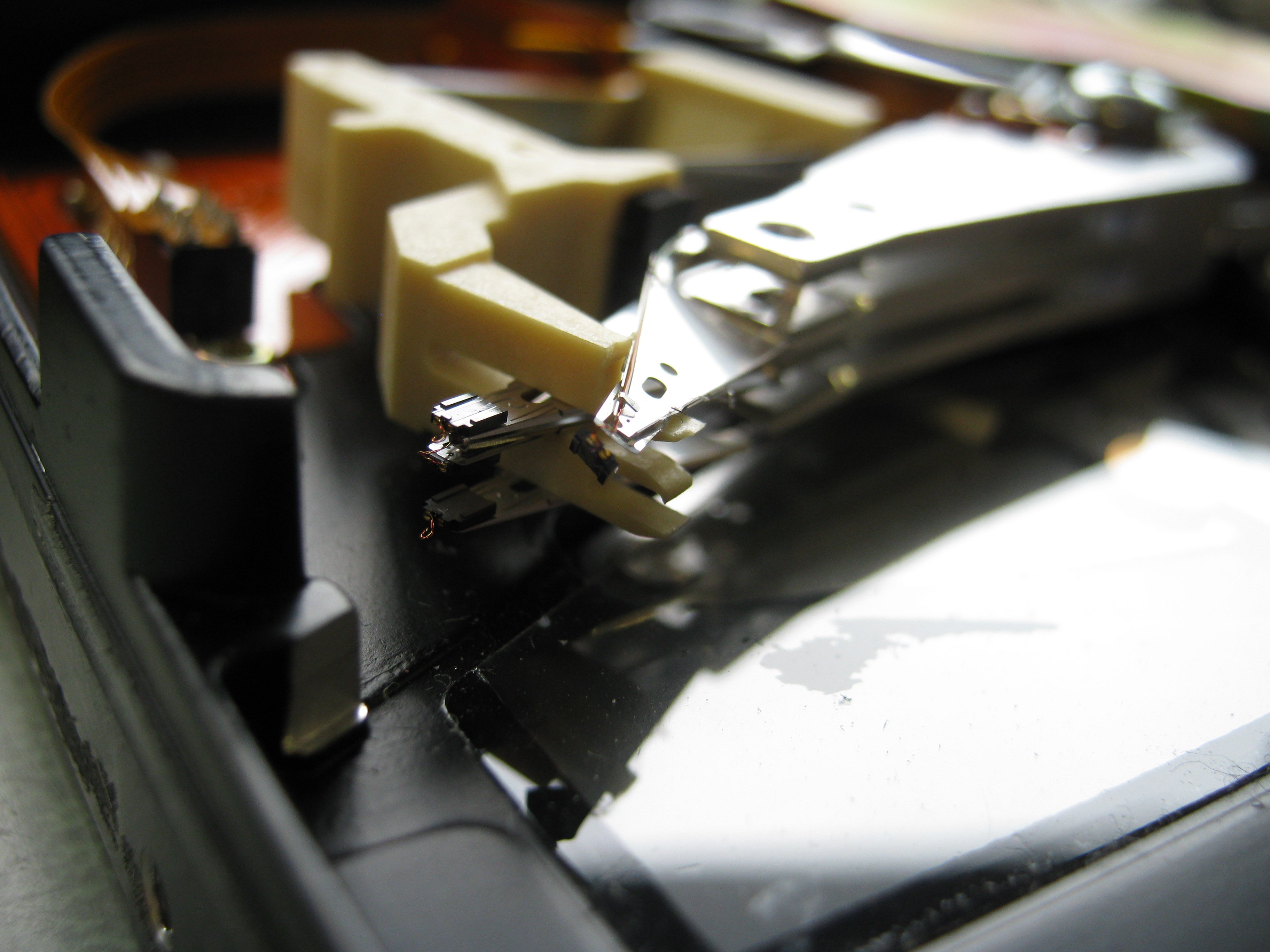 Although this bulkier, larger, lower capacity technology was tolerant to some DIY data recovery efforts, the Jaz drive seems pretty vulnerable during normal use. The act of essentially jamming platters in and out of an open hard drive creates problems, and the Jaz system has limited ability to keep out contaminants over time. When we were testing the University’s supplied Jaz drive, we found one simply had a mangled read/write head. The internet suggests that this was common when you forced a disc to eject. The edge of the platter simply caught the read/write head assembly and bent it.