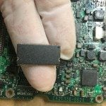 By the time Mike removed the ROM chips, the acid had already eaten through enough of the solder on some of the other components of the PCB that they could simply be brushed off of the board with a light touch. The greatest danger here was that the leads on the ROM chip would be eaten away as well. The leads allow signals to travel from the chip into the PCB and vice versa. If this happened, it would reduce the critical—and utterly irreplaceable—ROM chips to inert and useless black rectangles.